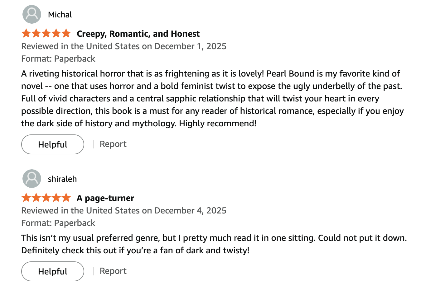 This riveting sapphic gothic horror novel is imbued with exquisite detail and a sense of locale that deftly amplifies the terror taking place in a wealthy New England estate at the turn of the century. The author adroitly upends us in the best sort of way as the novel twists and swerves through lush landscapes and sitting rooms, heavenly scented bathtubs, tea parties, and a forbidden affair between members of the different classes while shocking us with visceral, magical, unforgettable horror. Hooked from the first chapter, this novel delivers from start to finish with the unexpected and the incredible weaved into a richly spun tale of an upper class home that hides particular cruelties. Nature, magic, misplaced affection, and the resilience of a young woman who carries an incredible legacy all lead to an explosive, satisfying finish. Readers who’ve enjoyed works like Sarah Waters’ Fingersmith and Plain Bad Heroines by Emily M. Danforth will love Pearl Bound.